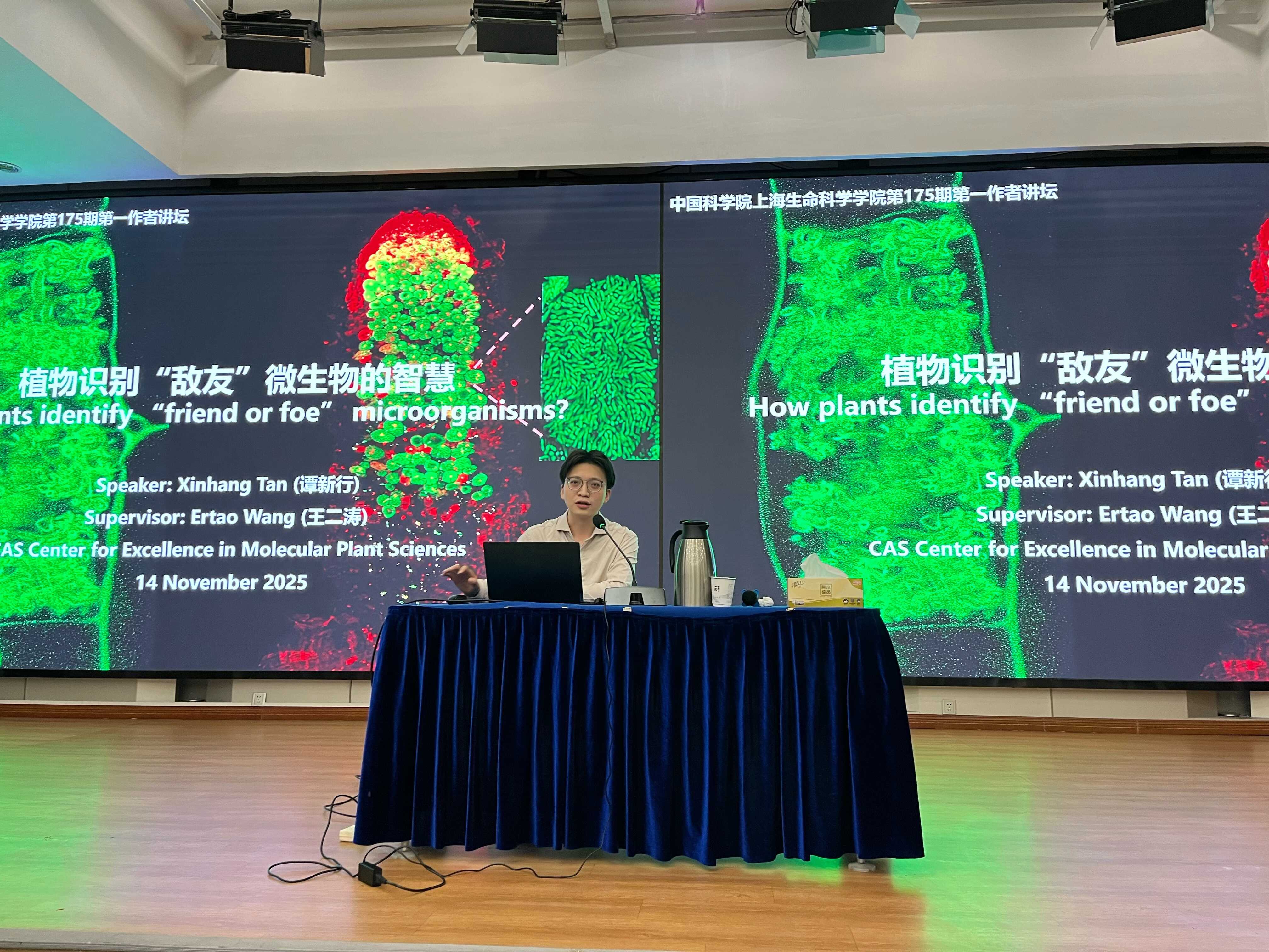 11月14日下午,第175期“第一作者讲坛”在中国科学院上海教育基地报告厅顺利举办。中国科学院分子植物科学卓越创新中心王二涛研究组博士研究生谭新行作了题为《植物识别“敌友”微生物的智慧》的精彩报告,王二涛研究员作为特邀嘉宾出席并点评。
