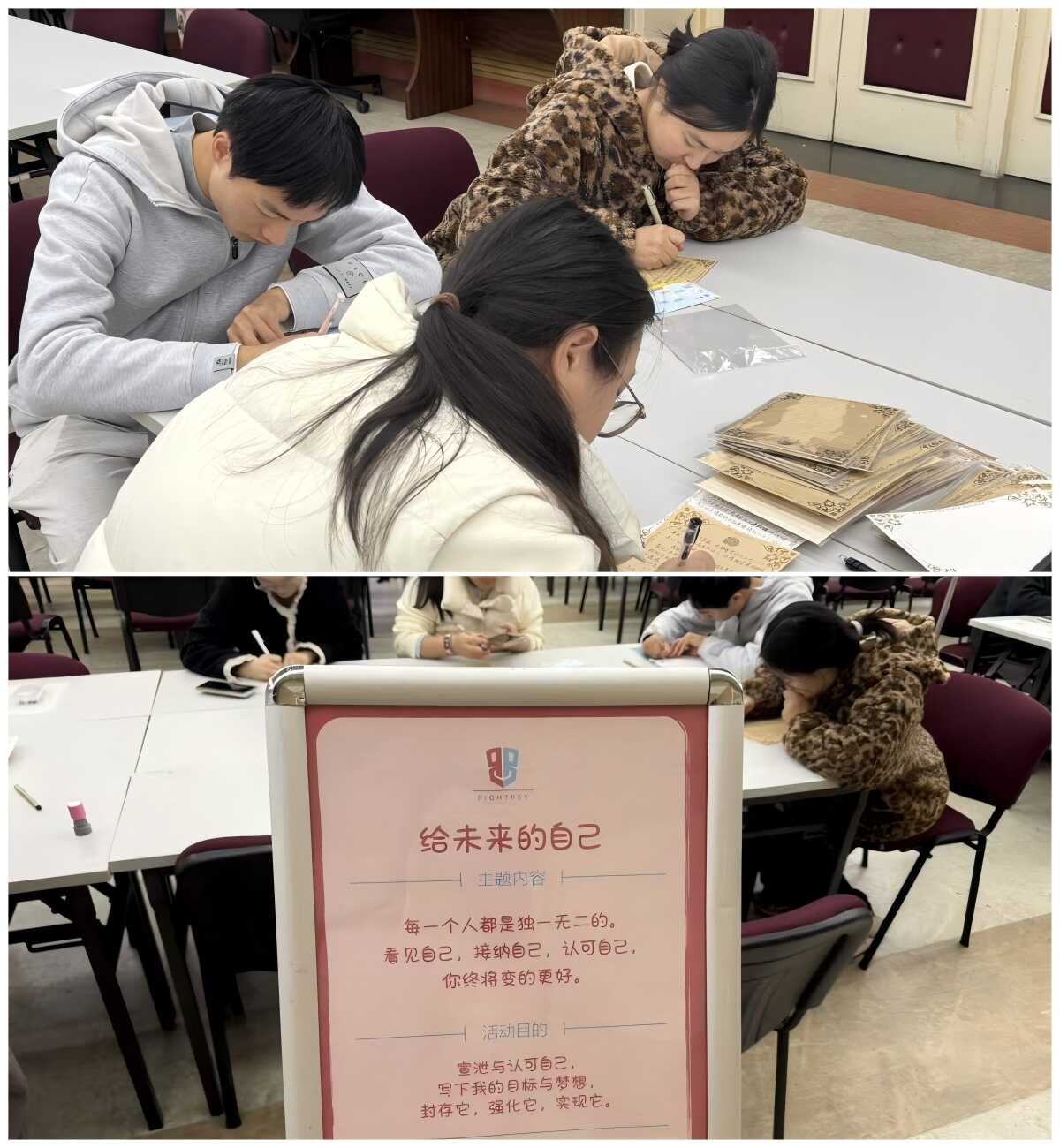 在这个安静而充满仪式感的角落,同学们提笔写信,与未来的自己展开一场心灵对话。信中写下对科研生活的期待、对个人成长的愿景,或是一份温柔的自我鼓励。最后,每一封信都通过火漆印章郑重封存,成为一份寄往未来的时间礼物。