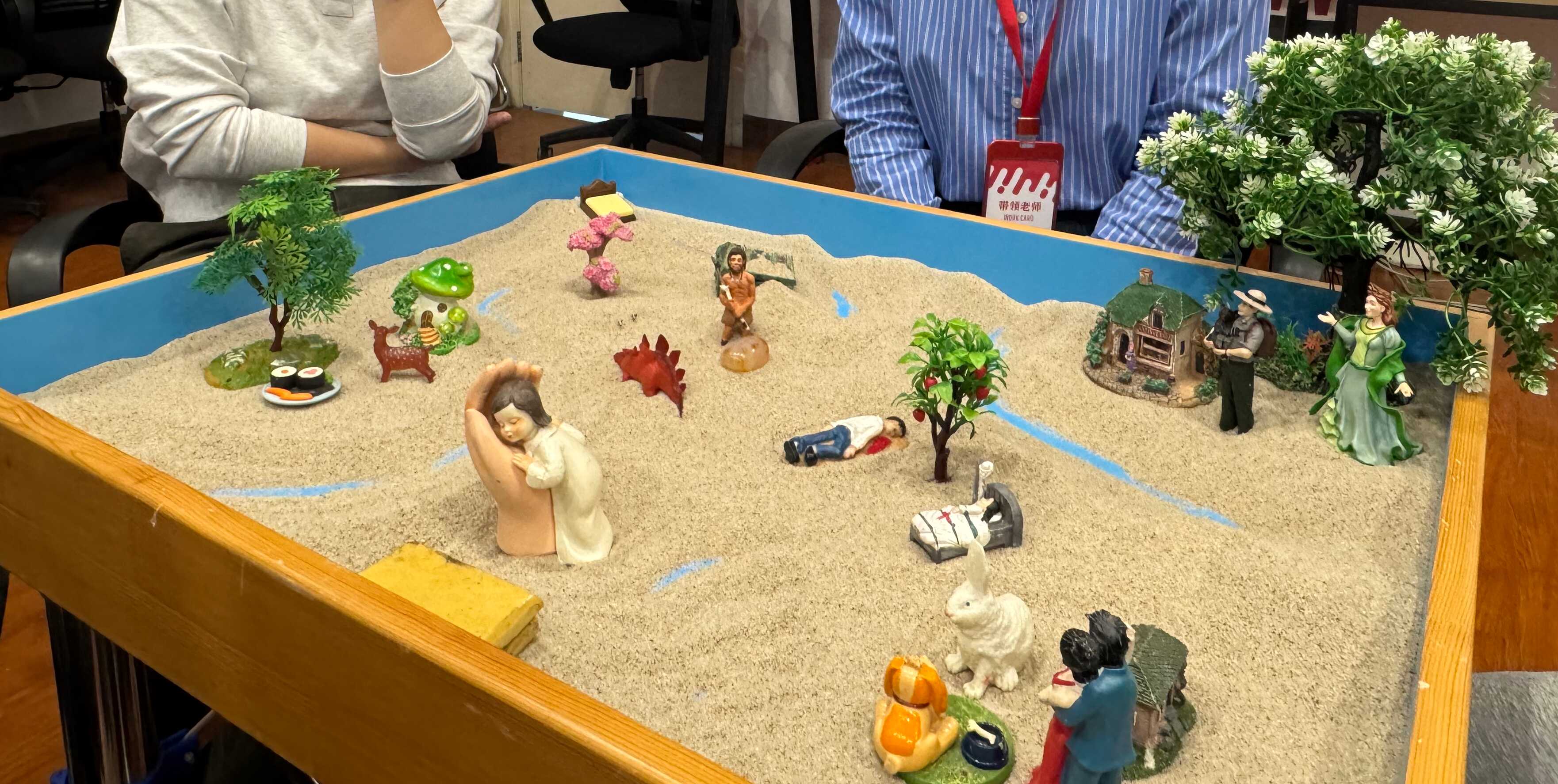 一沙一世界,一方沙盘成为内心图景的缩影。同学们自由挑选微缩模型,在沙中构建属于自己的场景。在安全、包容的氛围中,沙盘成为一种非语言的表达方式,让情绪得以安放,让无意识的内容得以浮现,进而促进自我理解与内在整合。