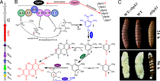 Prof. WANG Chengshu’s group at the Institute of Plant and Physiology and Ecology, Shanghai Institutes for Biological Sciences, CAS, unveiled the biosynthetic machinery of oosporein in fungi. The polyketide synthase (PKS) gene cluster includes seven genes for oosporein biosynthesis. The PKS OpS1 produces orsellinic acid that is hydroxylated to 6-methyl-benzenetriol by the hydroxylase OpS4. The intermediate is oxidized to 6-methyl-benzenetetrol by the cupin-family oxygenase OpS7. The latter is further dimerized to oosporein by the catalase OpS5. The transcription factor OpS3 regulates intrapathway gene expression. Due to the keto-enol tautomerism, different intermediate metabolites were also identified, including the previously unidentified 5,5’-dideoxy-oosporein. Insect bioassays revealed that oosporein is employed by the fungus to facilitate insect killing by evading host cellular and humoral immunities. The results advance the current understanding of quinone biosynthetic mechanism, and the small-molecule type effector deployed by fungi to interact with their hosts.