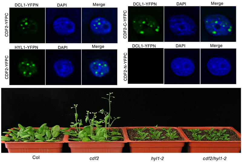 在真核生物中,20-30个核苷酸长度的小的非编码RNA(Small non-coding RNAs)是调控很多生物学过程的关键内部信号之一。基因组中编码miRNA的区域被称为MIR基因。类似于蛋白编码基因,MIR基因被RNA 聚合酶Ⅱ转录,然后被Dicer核酸内切酶RNAseⅢ加工成为成熟的miRNA, 这个过程在植物中由DCL1与HYPONASTIC LEAVES1(HYL)和 SERRATE(SE)相互作用而介导。 虽然miRNA加工过程的分子机理已经比较清楚,但是关于miRNA合成的精细调控机理依旧存在很多未解之谜。方玉达研究组长期研究植物microRNA的合成途径的细胞生物学基础,在发现植物microRNA剪切小体(Dicing body)上进一步剖析DCL1的作用机制等方面取得了一系列研究成果。本研究在以DCL1中双链RNA结合域为诱饵,通过酵母双杂交筛选发现拟南芥DCL1与转录因子CDF2存在直接的相互作用。CDF2能够作为转录因子起始部分miRNA基因的转录过程,同时CDF2能直接结合由它转录出来的pri-miRNA,影响这些pri-miRNA的剪切过程,从而调节植物的生长发育过程。该研究进一步解析了miRNA加工过程的调控机理,同时为揭示miRNA转录到剪切的偶联过程进一步奠定了基础。