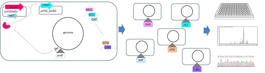 杨晟研究组开发的这套CRISPR-Cpf1基因组编辑方法,结合单链重组系统实现了基因组精细修改,最高效率达到100%;亦可实现大片段缺失和插入,将原先每轮一周的基因组编辑操作缩短到3天。以L-脯氨酸合成代谢关键酶 γ-谷氨酰激酶的149位甘氨酸为例,应用CRISPR-Cpf1基因组编辑系统对其实施原位饱和点突变,可成功筛选获得抗L-脯氨酸反馈抑制的高产菌株。