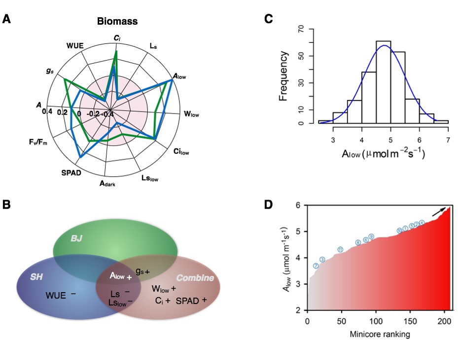 图注说明:(A)叶片光合参数与生物产量在不同地点的Pearson相关性;(B)特征选择鉴别解释生物量变异的关键光合参数;(C-D)低光光合利用率Alow在204份水稻自然群体和11个当代商业品种中的自然变异。
