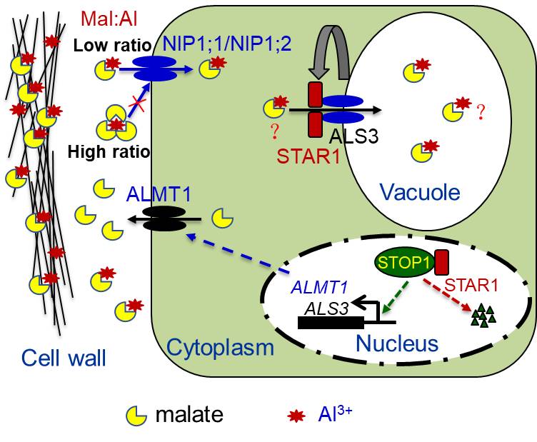 综述所述,该研究揭示了苹果酸的分泌量决定苹果酸-铝复合物是否被排斥在细胞外还是转运进入细胞内。质膜定位的水孔蛋白NIP1;1/NIP1;2与液泡膜定位的STAR1/ALS3 ABC转运蛋白相互协作介导了苹果酸-铝复合物从细胞外至细胞内,最终进入液泡中实现内部解铝毒,并且帮助植物对苹果酸进行再利用,减少碳损失。ALS3依赖的STAR1能够与STOP1直接互作并促进其降解从而调控苹果酸的分泌和植物的内外部解铝毒。
