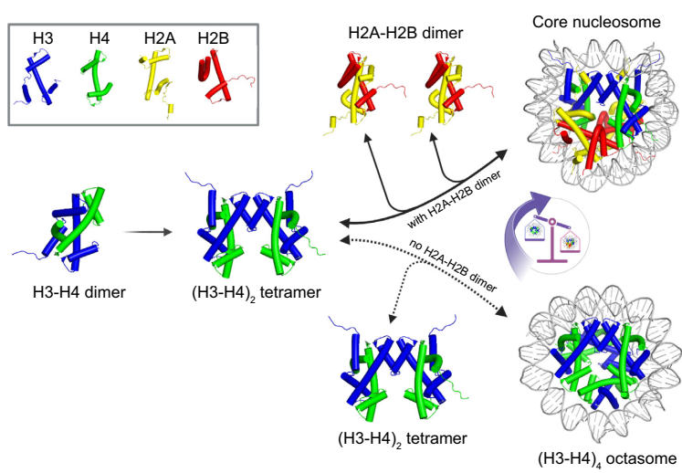 图1 经典核小体(H2A-H2B-H3-H4八聚体)与“古核小体”(H3-H4八聚体)组装的平衡模型