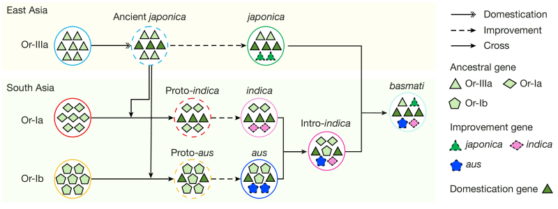 基于高质量的基因组序列,对亚洲栽培稻各类群中的早期关键驯化基因进行单倍型分析,证明所有亚洲栽培稻的驯化位点均来源于粳稻祖先Or-IIIa,进一步证实了亚洲栽培稻单起源假说,为持续数十年的学术争议提供了关键证据。此外,研究还发现在南亚各栽培稻类群之间存在广泛的基因交流,并由此定义了一个新的栽培稻亚群intro-indica,成功绘制了一副更全面的水稻进化和驯化路线图。
