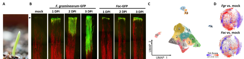 本研究首次在单细胞分辨率上揭示了小麦幼苗响应非寄主镰孢菌侵染的免疫反应局域化特征,提出了禾谷镰孢菌推迟和减轻小麦的早期免疫反应与寄主建立易感互作关系。本研究结果为小麦抗赤霉病育种提供了新的理论依据和更多的抗病候选基因。