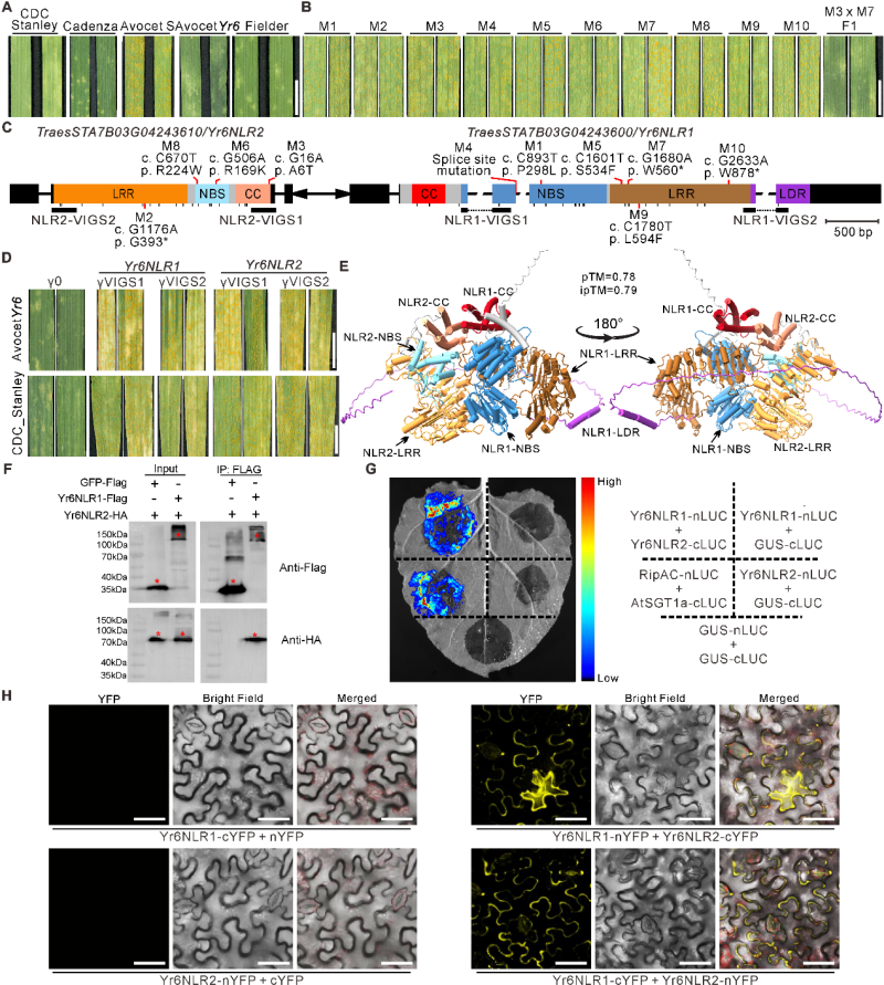 研究团队与合作者在Plant Communications发表的题为“Genome-based mutant RNA mapping(GMRM)identifies an NLR pair underlying Yr6-mediated stripe rust resistance in wheat”的研究工作开发了一种以contig组装水平基因组为参考,通过分析多个EMS突变体二代转录组数据快速克隆控制目标性状基因的新方法GMRM(开源代码:https://github.com/Dentalium/Rapid-cloning-of-Yr6)。利用这一方法,团队成功从加拿大普通小麦品种CDC_Stanley中克隆了抗小麦条锈病基因Yr6。Yr6是由一对头对头排列的Yr6NLR1和Yr6NLR2共同控制。AlphaFold 3蛋白质结构预测显示Yr6NLR1和Yr6NLR2之间存在直接相互作用,后续团队进一步通过小麦原生质体的免疫共沉淀(Co-IP)、本氏烟叶片的荧光素酶互补(SFLC)以及双分子荧光互补(BiFC)实验验证了Yr6NLR1和Yr6NLR2蛋白之间直接相互作用(图1)。