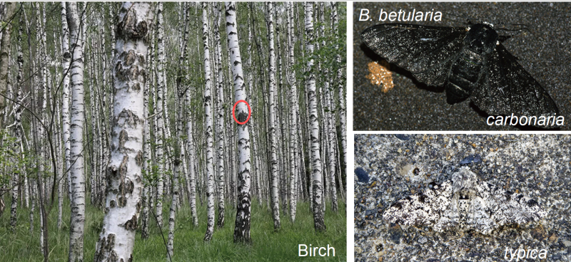 图1:“工业黑化”桦尺蛾的“开放式”生态场景。(Photo credit: Silver birch, AJC1, and Ben Sale on Wikimedia Commons CC BY-SA).