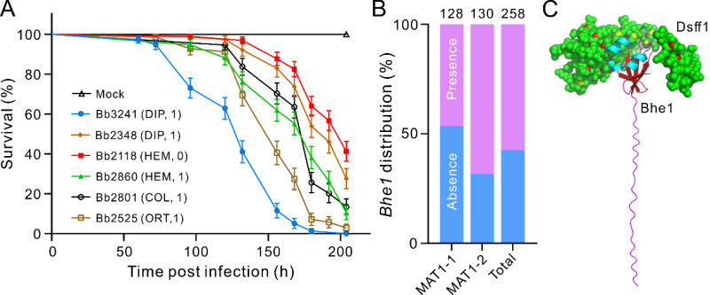 在前期白僵菌种群遗传研究的基础上(ISME J, 2020),他们针对近300个球孢白僵菌菌株按原始分离寄主、以昆虫目为单元进行分组,基因组关联分析表明:初始分离自双翅昆虫的菌株基因组存在两个异常位点(outlier)。进一步针对不同位点编码基因进行基因缺失及生物测定,获得显著影响白僵菌感染蝇类昆虫的潜在效应子基因Bhe1,该基因不仅在不同菌株中存在有无的二元分布特征,编码蛋白也存在长度差异。Bhe1基因缺失突变株感染双翅目的蚊虫及其他目昆虫的毒力不受影响。