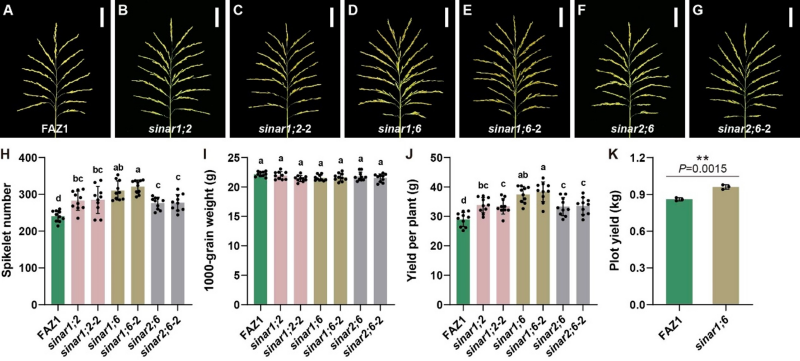 研究组通过筛选类受体激酶OsER1胞内激酶结构域的互作蛋白,鉴定到一个水稻SINA泛素连接酶家族,并命名为SINARs。该家族包含6个成员(SINAR1~6),都具有保守的RING结构域,而且均能对OsER1进行K63位泛素化。接着,利用亚细胞和生化实验证实了SINARs均能够靶向OsER1促使其通过多囊泡体介导的液泡途径降解。在此基础上,研究组系统鉴定了该家族成员基因的表达模式,并利用CRISPR/Cas9基因编辑技术,在粳稻中花11背景下通过敲除SINAR1、SINAR2、SINAR3、SINAR4、SINAR5和SINAR6等基因,获得了一系列不同基因功能缺失突变体。这些突变体不同程度上影响了水稻每穗粒数和粒型大小等产量性状。通过考察不同突变组合的双突、三突和四突表型发现,SINAR1和SINAR6基因负向协同性调控水稻每穗粒数,而SINAR2、SINAR3、SINAR4和SINAR5基因则正向冗余性调控水稻每穗粒数。