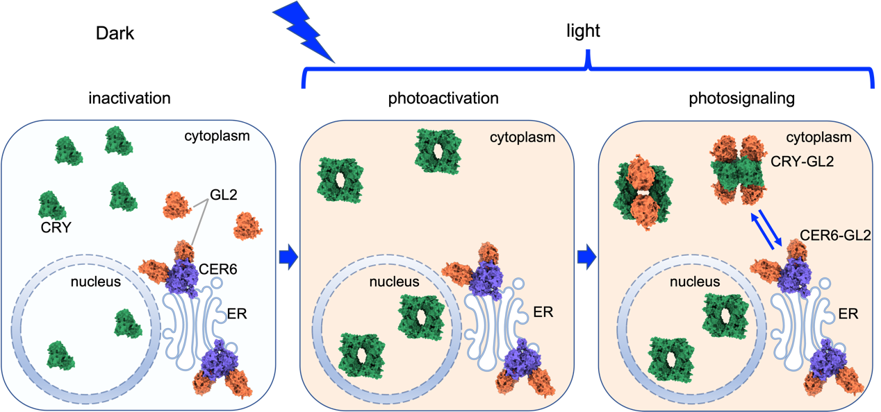 图2. 植物蓝光受体CRY信号复合体组装、调控蜡质合成的模型