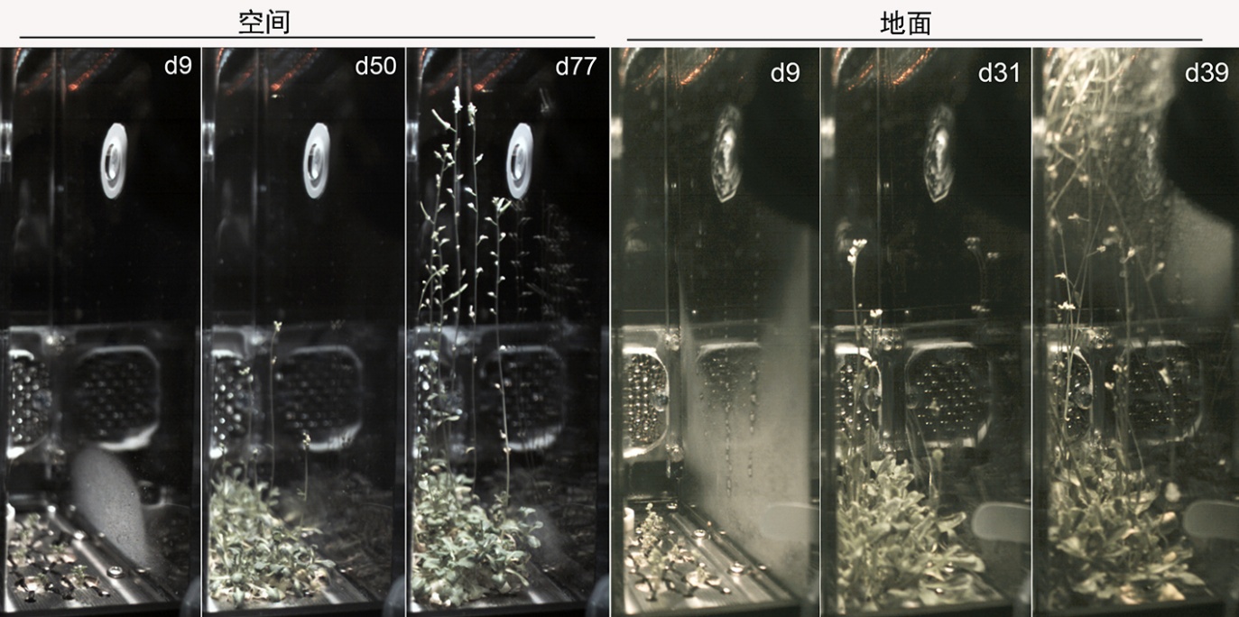 图1. 与地面正常重力条件下生长的拟南芥相比,空间微重力条件下生长的拟南芥开花时间显著延长。空间拟南芥d9,d50和d77和地面拟南芥d9,d31和d39代表性的图像,d表示加注营养液启动实验后的天数。