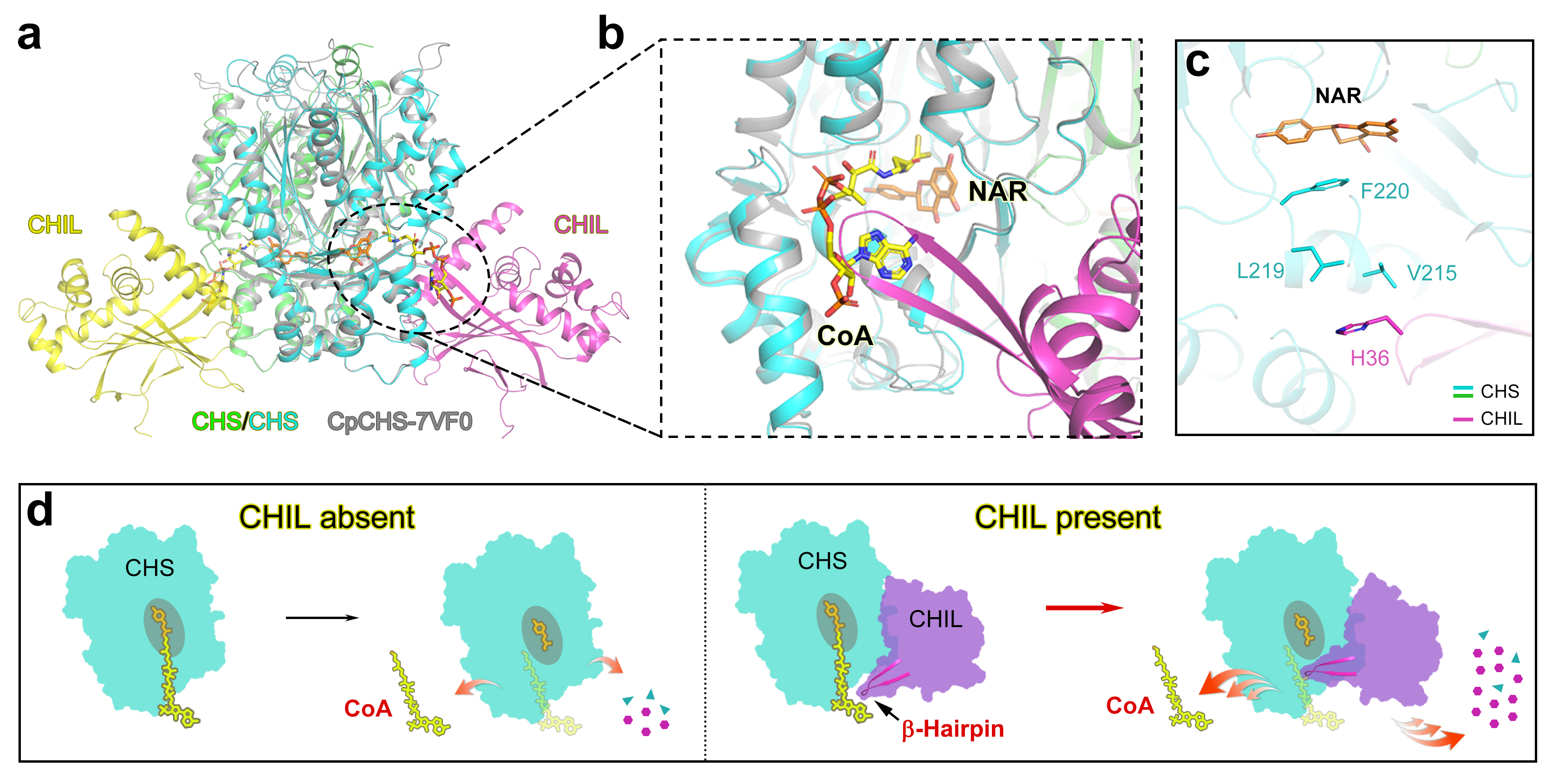 在没有CHIL结合时,CHS的催化效率较低,且因产物CoA释放缓慢而产生更多副产物;当CHIL与CHS结合后,其-Hairpin结构不仅能加速CoA释放,还可以稳定CHS活性位点的正确构象,所以CHS的催化效率显著提高,副产物大大减少。